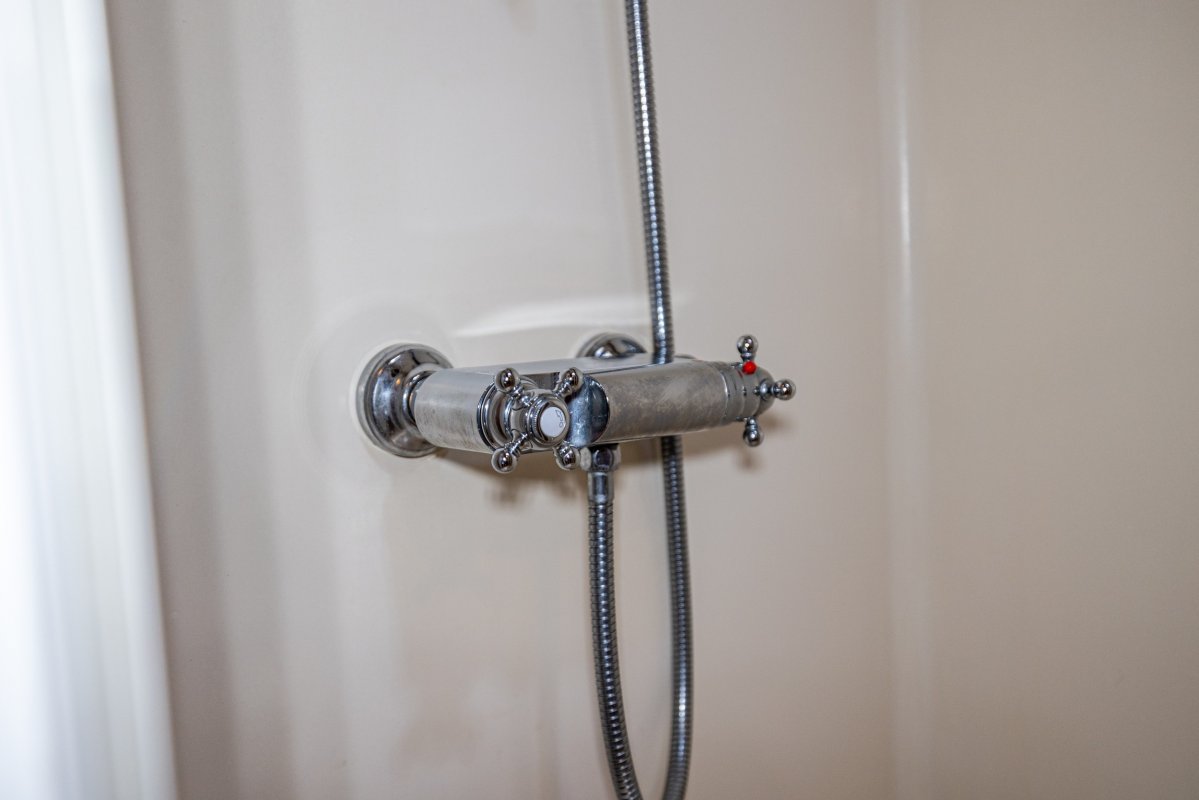 De badkamermuur is in 2023 geschuurd en opnieuw gelakt. Alle