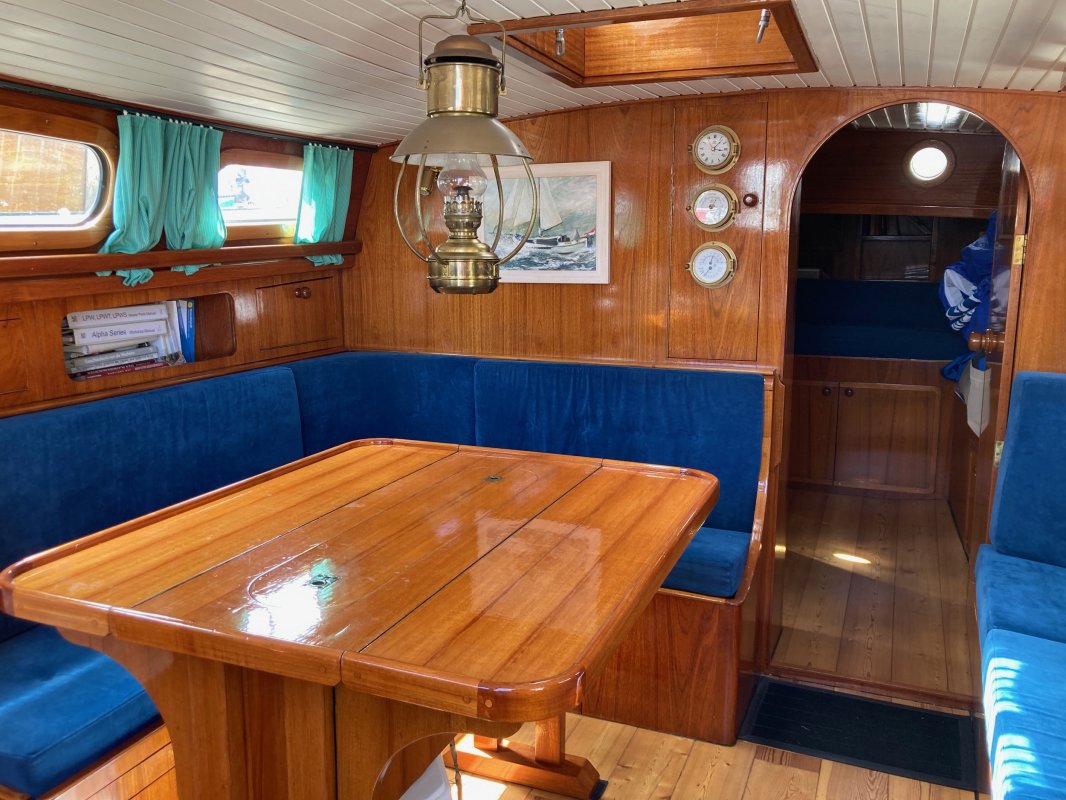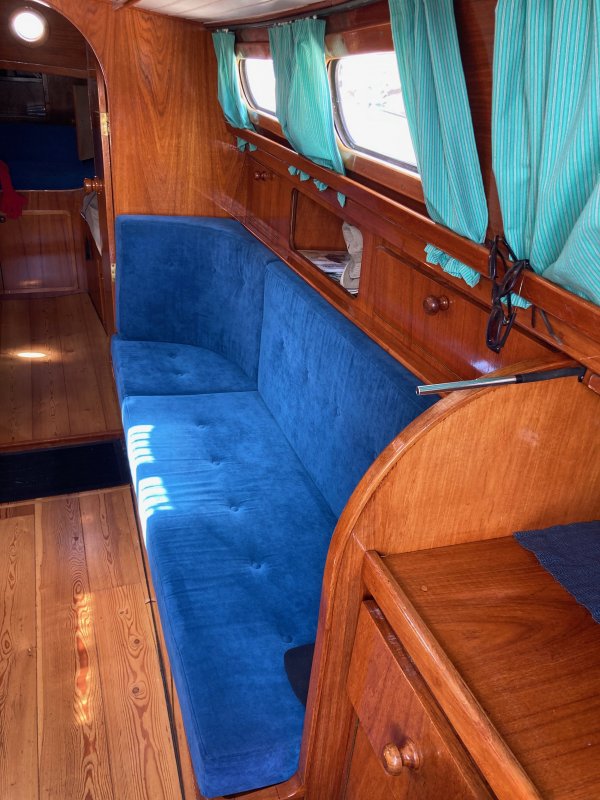 Teak interieur met grenen vloerdelen.